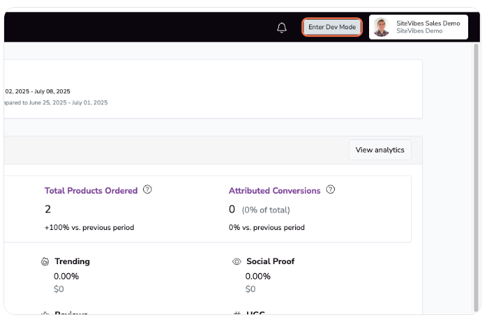 Log in to your SiteVibes account at https://app.sitevibes.com and click on Enter Dev Mode at the top of the dashboard.