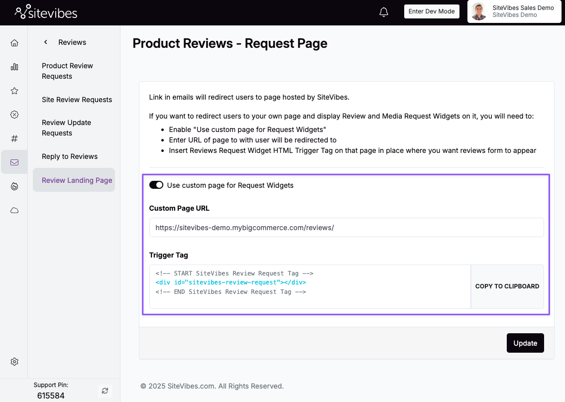 - In SiteVibes, go to Email → Reviews → Product Review Requests → Review Landing Page Widget.